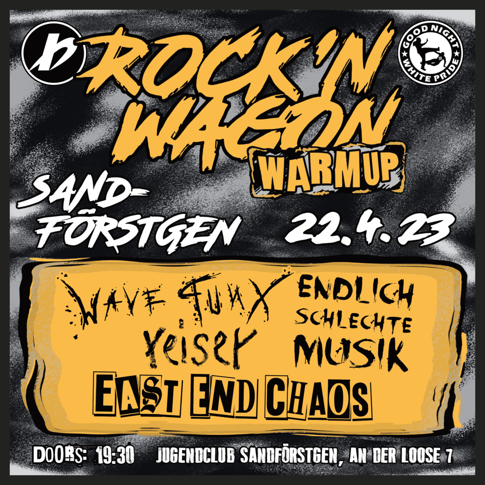 Zum Einstimmen auf das bevorstehende Rock’n Wagon Festival gibt es ein Warm-Up Konzert am 22. April im Jugendclub Sandförstgen. Mit am Start: Wave Punx, Reiser, Endlich Schlechte Musik und East End Chaos.